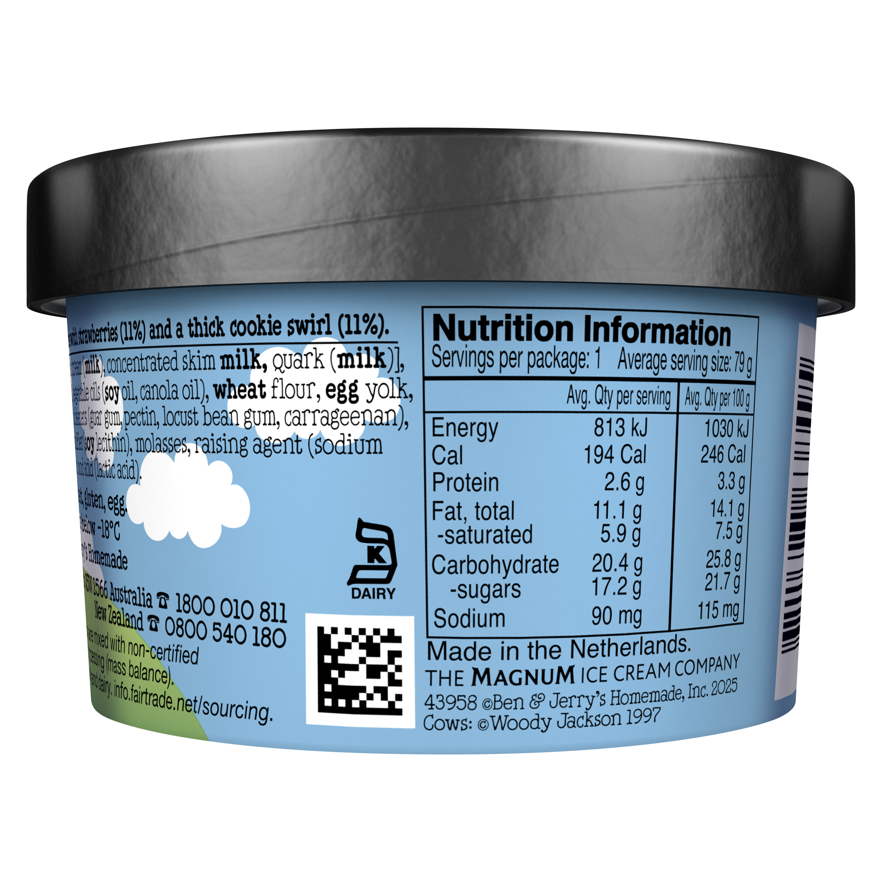 Zutaten: RAHM (24%), Zucker, Trinkwasser, KONDENSMAGERMILCH, Erdbeerpüree (6%), Erdbeerstücke (5%), pflanzliche Öle (Soja, Raps), Mehl (WEIZEN, WEIZENVOLLKORN), EIGELB, Maisstärke, FRISCHKÄSE (0,9%), BUTTERFETT, Stabilisatoren (Pektine, Guarkernmehl, Johannisbrotkernmehl, Carrageen), Zitronensaftkonzentrat, Speisesalz, Emulgator (Lecithine (SOJA)), Honig, Backtriebmittel (Natriumhydrogencarbonat), natürliches Aroma, Holundersaftkonzentrat, Säureregulator (Milchsäure). Fairtrade-Zucker, -Honig mit Mengenausgleich. Gesamtanteil: 47% ohne Wasser und Molkereiprodukte(F).