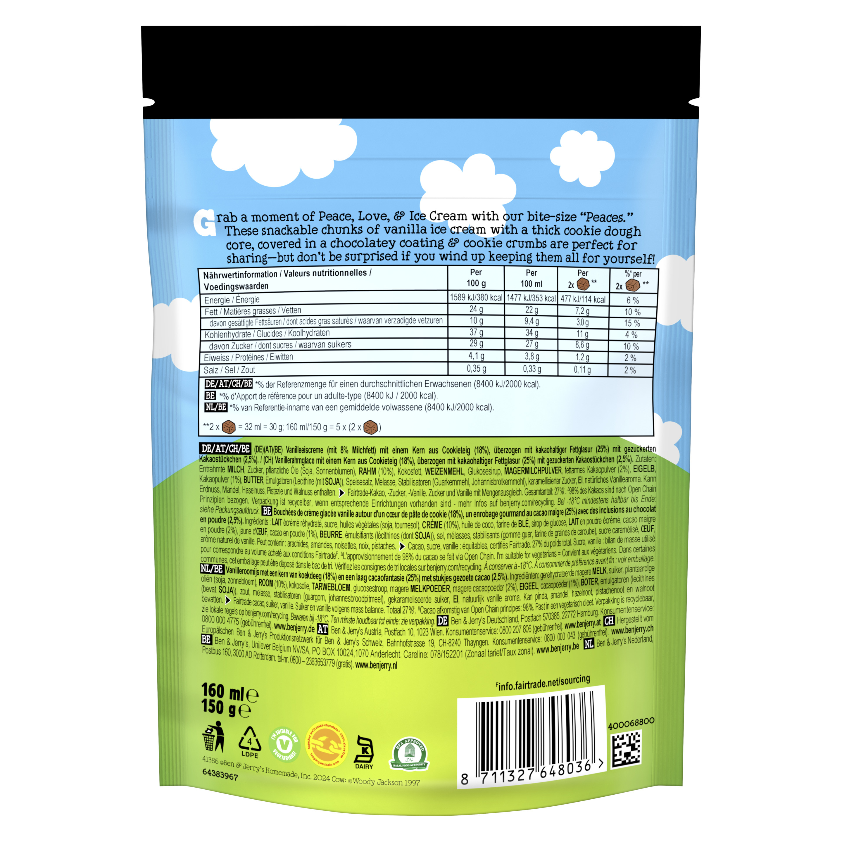 Zutaten: Entrahmte MILCH, Zucker, pflanzliche Öle (Soja, Sonnenblumen), RAHM (10%), Kokosfett, WEIZENMEHL, Glukosesirup, MAGERMILCHPULVER, fettarmes Kakaopulver (2%), EIGELB, Kakaopulver (1%), BUTTER, Emulgatoren (Lecithine (mit SOJA)), Speisesalz, Melasse, Stabilisatoren (Guarkernmehl, Johannisbrotkernmehl), karamellisierter Zucker, EI, natürliches Vanillearoma. Kann Erdnuss, Mandel, Haselnuss, Pistazie und Walnuss enthalten.Fairtrade-Kakao, -Zucker, -Vanille. Zucker und Vanille mit Mengenausgleich. Gesamtanteil: 27%(F). Δ98% des Kakaos sind nach Open Chain Prinzipien bezogen.