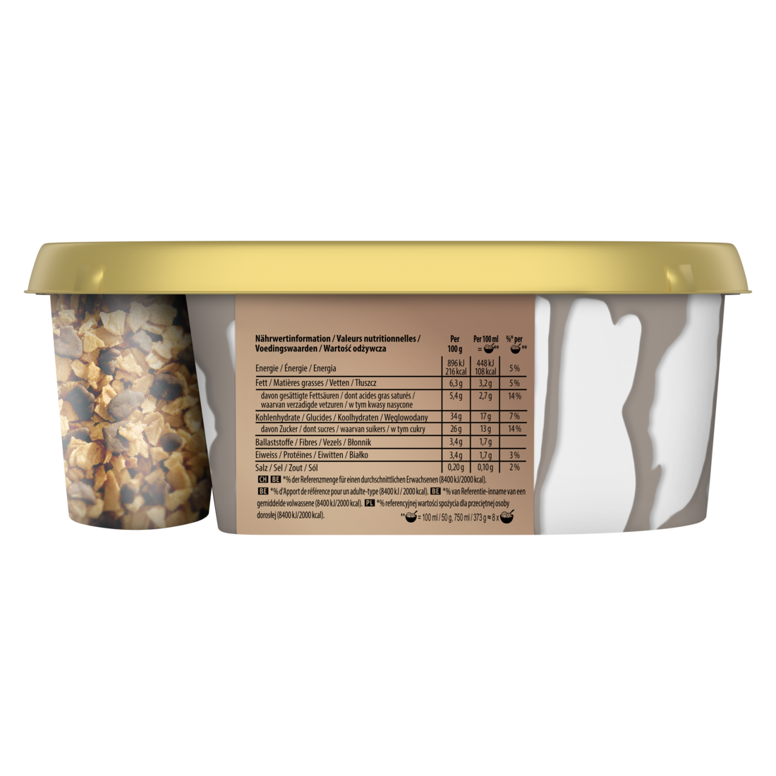 Zutaten: entrahmte MILCH, Dextrose, Zucker, Glukose-Fruktose-Sirup, WEIZENMEHL, Kokosfett, Fruktose, pflanzliche Ballaststoffe aus Mais, MAGERMILCH-Pulver oder -Konzentrat, fettarmes Kakaopulver (1,1%), Kakaomasse (0,7%), Kakaopulver (0,4%), Emulgatoren (Mono- und Diglyceride von Speisefettsäuren, Lecithine (mit SOJA)), Kartoffelstärke, Stabilisatoren (Guarkernmehl, Tarakernmehl, Johannisbrotkernmehl, Carrageen), Farbstoff (Zuckerkulör), natürliches Vanillearoma¹, Salz, Kakaobutter (0,05%). Kann GERSTE, EI, MANDEL, HASELNUSS, WALNUSS, PECANNUSS, PISTAZIE enthalten. ¹Rainforest Alliance-zertifiziert.