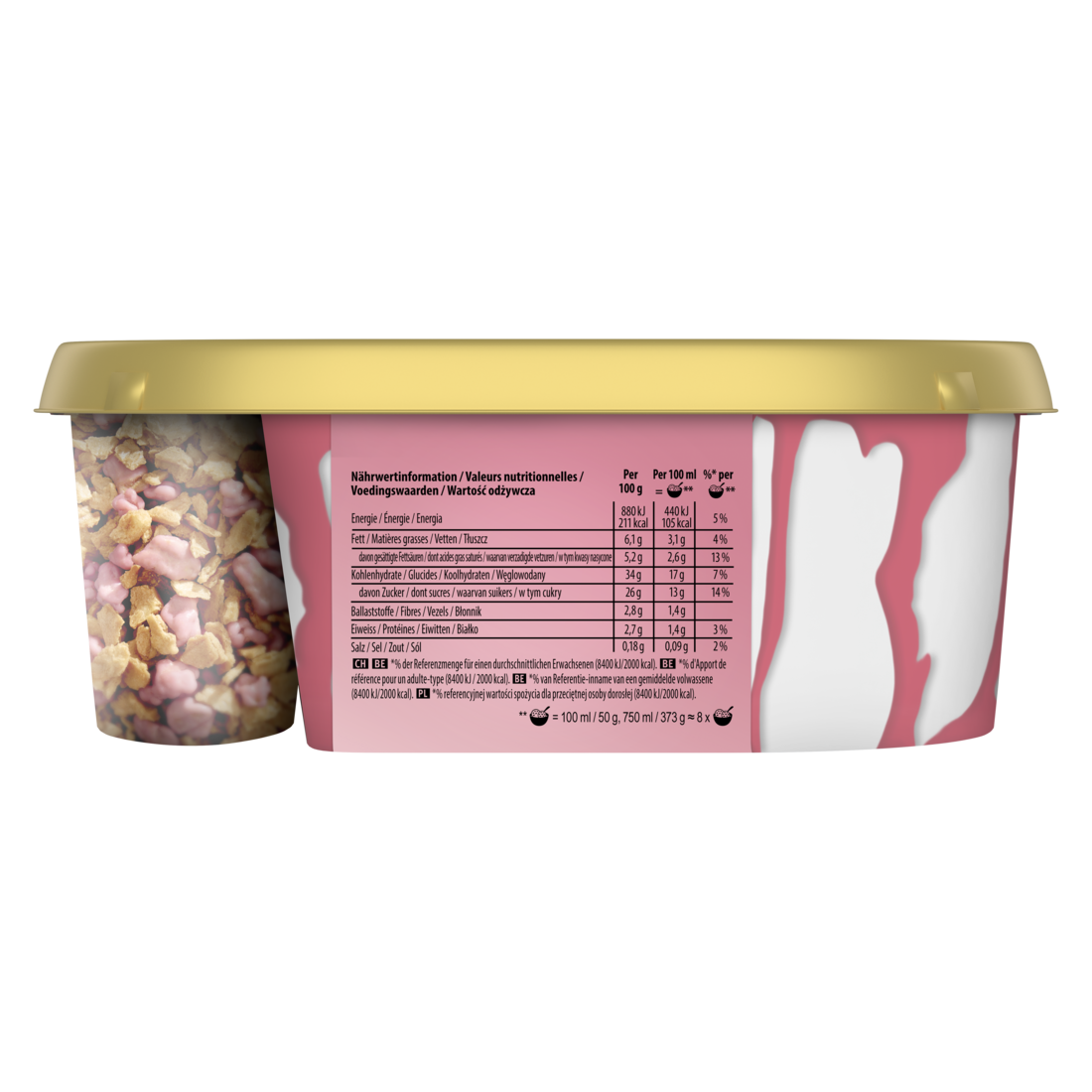 Zutaten: entrahmte MILCH, Glukose-Fruktose-Sirup, Dextrose, WEIZENMEHL, Zucker, Kokosfett, Wasser, Fruktose, pflanzliche Ballaststoffe aus Mais, Glukosesirup, Erdbeerpüree (1,6%), MAGERMILCH-Pulver oder -Konzentrat, Kakaobutter, VOLLMILCHPULVER, Emulgatoren (Mono- und Diglyceride von Speisefettsäuren, Lecithine (mit SOJA)), Stabilisatoren (Guarkernmehl, Johannisbrotkernmehl, Tarakernmehl), Kartoffelstärke, Farbstoff (Zuckerkulör), natürliches Vanillearoma¹, Salz, Säureregulator (Citronensäure), Holundersaftkonzentrat, natürliche Aromen, modifizierte Stärke, Überzugsmittel (Gummi arabicum), Rettichsaftkonzentrat, Schwarzer-Johannisbeersaft-Konzentrat, Apfelsaftkonzentrat. Kann GERSTE, EI, MANDEL, HASELNUSS, WALNUSS, PECANNUSS, PISTAZIE enthalten. ¹Rainforest Alliance-zertifiziert.