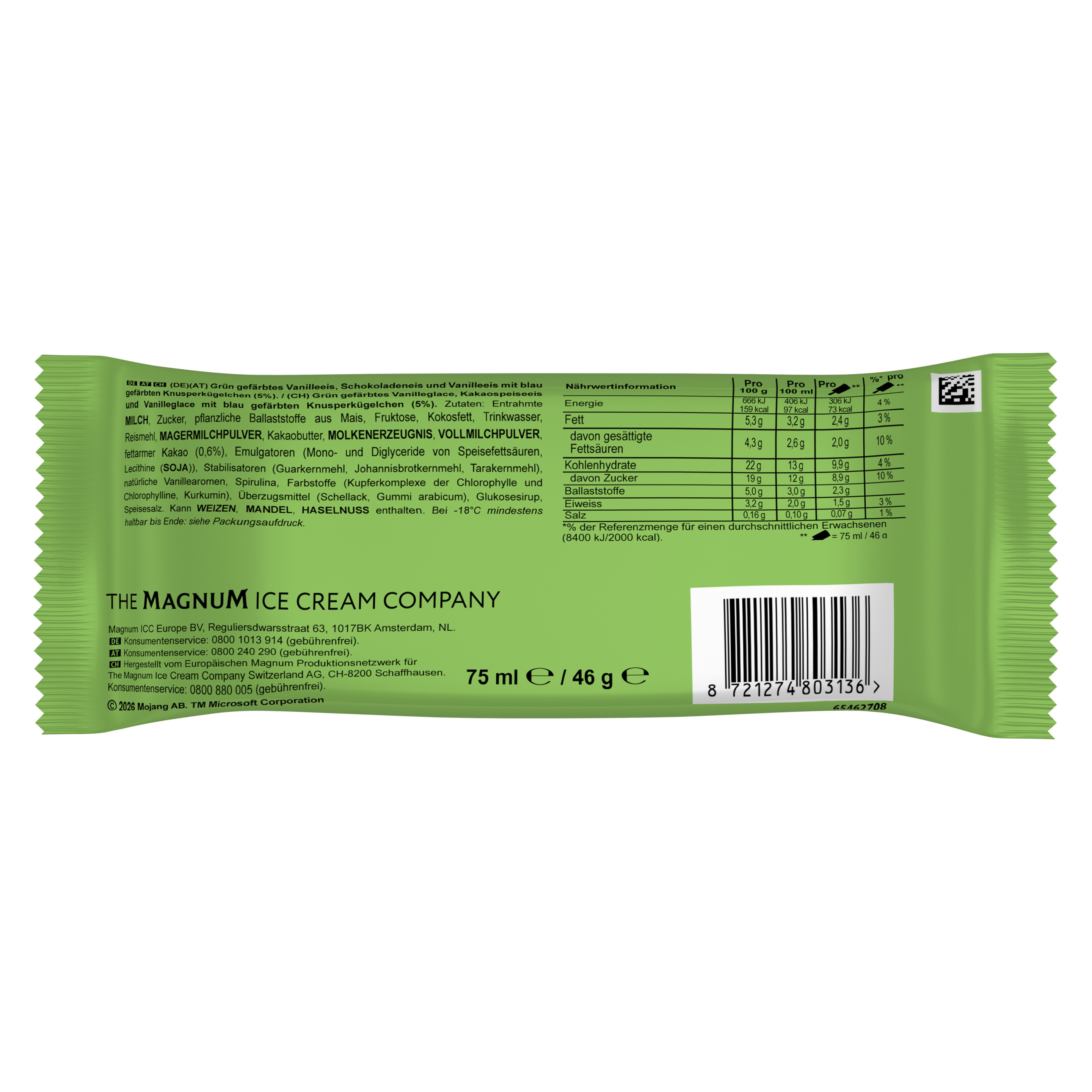 Zutaten: Entrahmte MILCH, Zucker, pflanzliche Ballaststoffe aus Mais, Fruktose, Kokosfett, Trinkwasser, Reismehl, MAGERMILCHPULVER, Kakaobutter, MOLKENERZEUGNIS, VOLLMILCHPULVER, fettarmer Kakao (0,6%), Emulgatoren (Mono- und Diglyceride von Speisefettsäuren, Lecithine (SOJA)), Stabilisatoren (Guarkernmehl, Johannisbrotkernmehl, Tarakernmehl), natürliche Vanillearomen, Spirulina, Farbstoffe (Kupferkomplexe der Chlorophylle und Chlorophylline, Kurkumin), Überzugsmittel (Schellack, Gummi arabicum), Glukosesirup, Speisesalz. Kann WEIZEN, MANDEL, HASELNUSS enthalten.