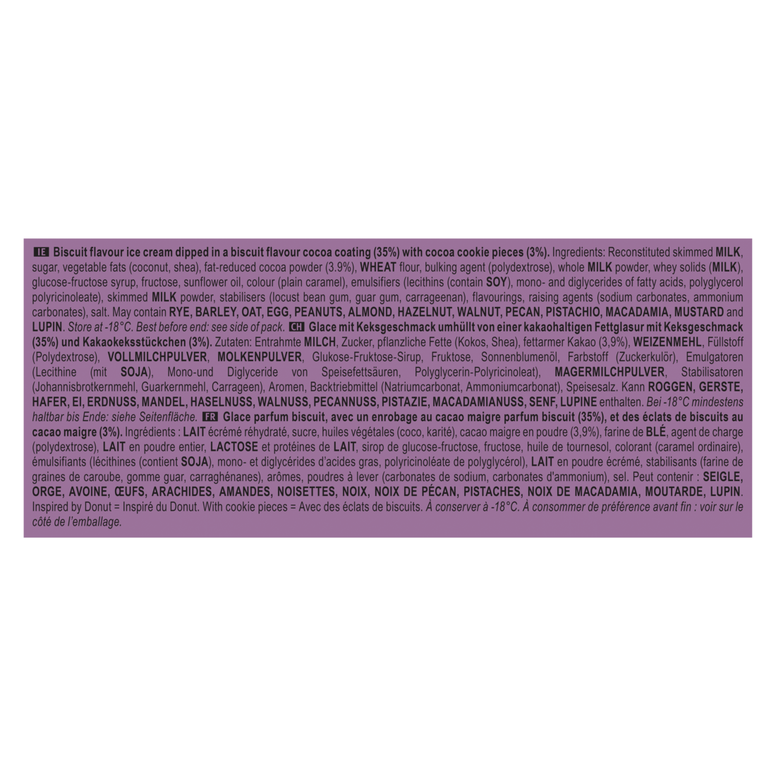 Zutaten: Entrahmte MILCH, Zucker, pflanzliche Fette (Kokos, Shea), fettarmer Kakao (3,9%), WEIZENMEHL, Füllstoff (Polydextrose), VOLLMILCHPULVER, MOLKENPULVER, Glukose-Fruktose-Sirup, Fruktose, Sonnenblumenöl, Farbstoff (Zuckerkulör), Emulgatoren (Lecithine (mit SOJA), Mono-und Diglyceride von Speisefettsäuren, Polyglycerin-Polyricinoleat), MAGERMILCHPULVER, Stabilisatoren (Johannisbrotkernmehl, Guarkernmehl, Carrageen), Aromen, Backtriebmittel (Natriumcarbonat, Ammoniumcarbonat), Speisesalz. Kann ROGGEN, GERSTE, HAFER, EI, ERDNUSS, MANDEL, HASELNUSS, WALNUSS, PECANNUSS, PISTAZIE, MACADAMIANUSS, SENF, LUPINE enthalten.