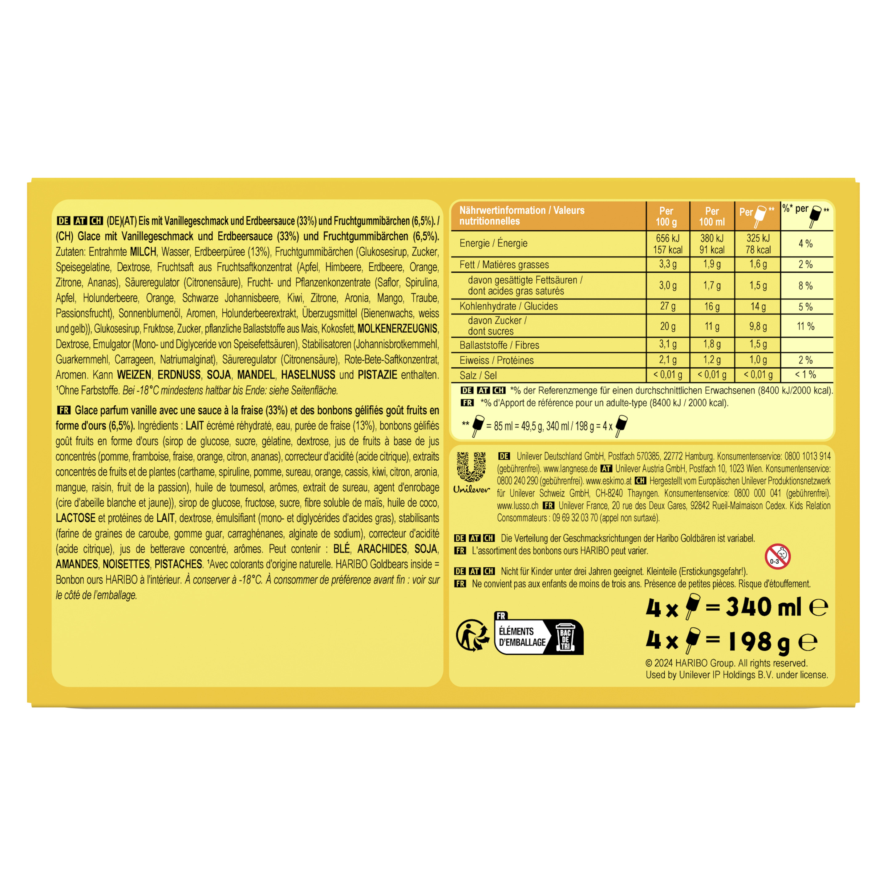 Zutaten: Entrahmte MILCH, Wasser, Erdbeerpüree (13%), Fruchtgummibärchen (Glukosesirup, Zucker, Speisegelatine, Dextrose, Fruchtsaft aus Fruchtsaftkonzentrat (Apfel, Himbeere, Erdbeere, Orange, Zitrone, Ananas), Säureregulator (Citronensäure), Frucht- und Pflanzenkonzentrate (Saflor, Spirulina, Apfel, Holunderbeere, Orange, Schwarze Johannisbeere, Kiwi, Zitrone, Aronia, Mango, Traube, Passionsfrucht), Sonnenblumenöl, Aromen, Holunderbeerextrakt, Überzugsmittel (Bienenwachs, weiss und gelb)), Glukosesirup, Fruktose, Zucker, pflanzliche Ballaststoffe aus Mais, Kokosfett, MOLKENERZEUGNIS, Dextrose, Emulgator (Mono- und Diglyceride von Speisefettsäuren), Stabilisatoren (Johannisbrotkernmehl, Guarkernmehl, Carrageen, Natriumalginat), Säureregulator (Citronensäure), Rote-Bete-Saftkonzentrat, Aromen. Kann WEIZEN, ERDNUSS, SOJA, MANDEL, HASELNUSS und PISTAZIE enthalten.