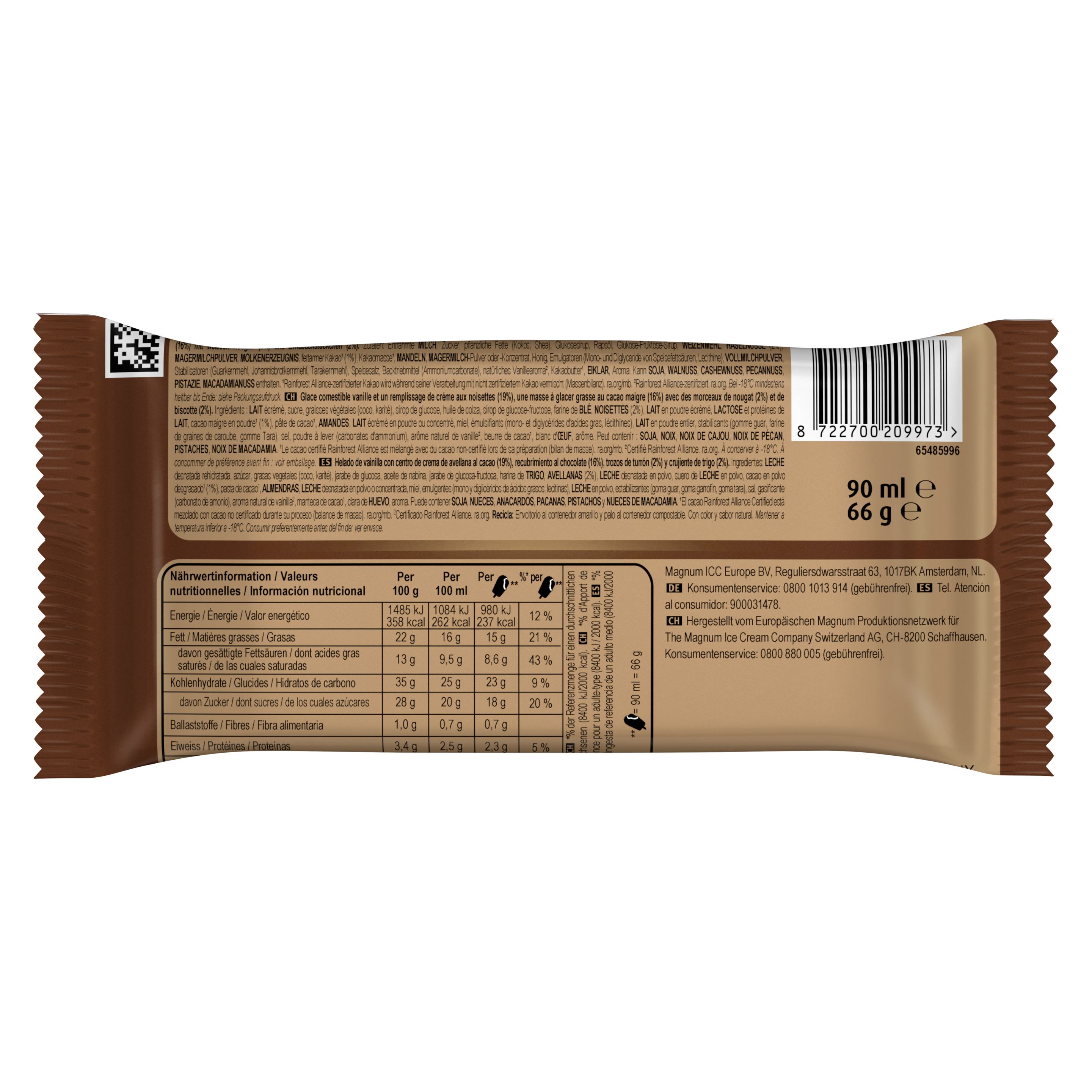 Zutaten: Entrahmte MILCH, Zucker, pflanzliche Fette (Kokos, Shea), Glukosesirup, Rapsöl, Glukose-Fruktose-Sirup, WEIZENMEHL, HASELNÜSSE (2%), MAGERMILCHPULVER, MOLKENERZEUGNIS, fettarmer Kakao¹ (1%), Kakaomasse¹, MANDELN, MAGERMILCH-Pulver oder -Konzentrat, Honig, Emulgatoren (Mono- und Diglyceride von Speisefettsäuren, Lecithine), VOLLMILCHPULVER, Stabilisatoren (Guarkernmehl, Johannisbrotkernmehl, Tarakernmehl), Speisesalz, Backtriebmittel (Ammoniumcarbonate), natürliches Vanillearoma², Kakaobutter¹, EIKLAR, Aroma. Kann SOJA, WALNUSS, CASHEWNUSS, PECANNUSS, PISTAZIE, MACADAMIANUSS enthalten. ¹Rainforest Alliance-zertifizierter Kakao wird während seiner Verarbeitung mit nicht zertifiziertem Kakao vermischt (Massenbilanz). ²Rainforest Alliance-zertifiziert.