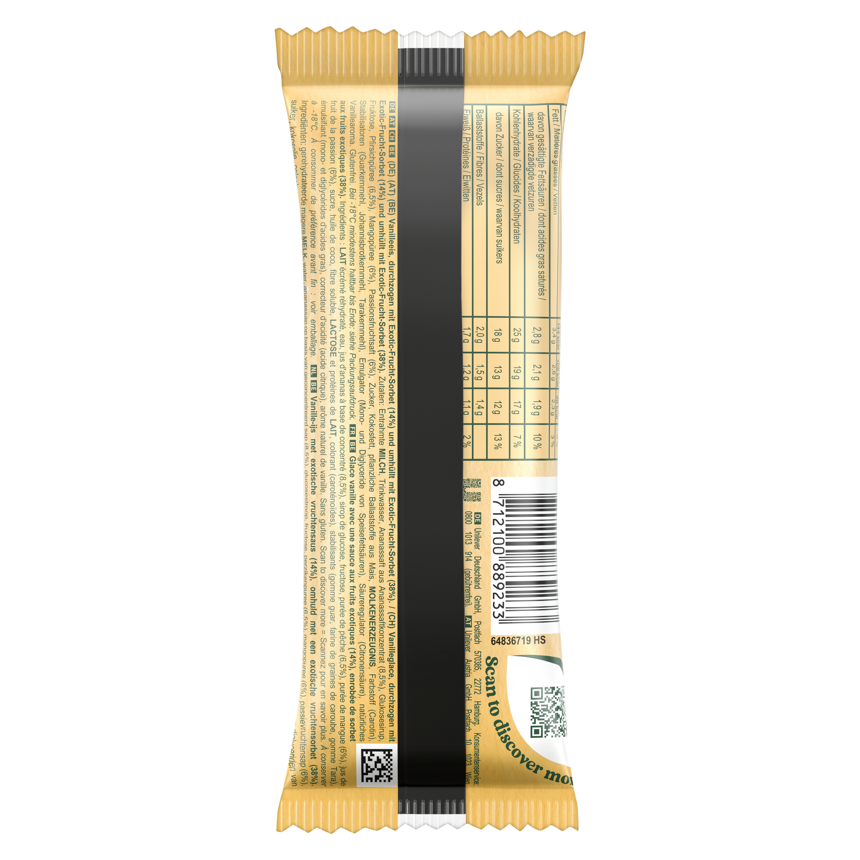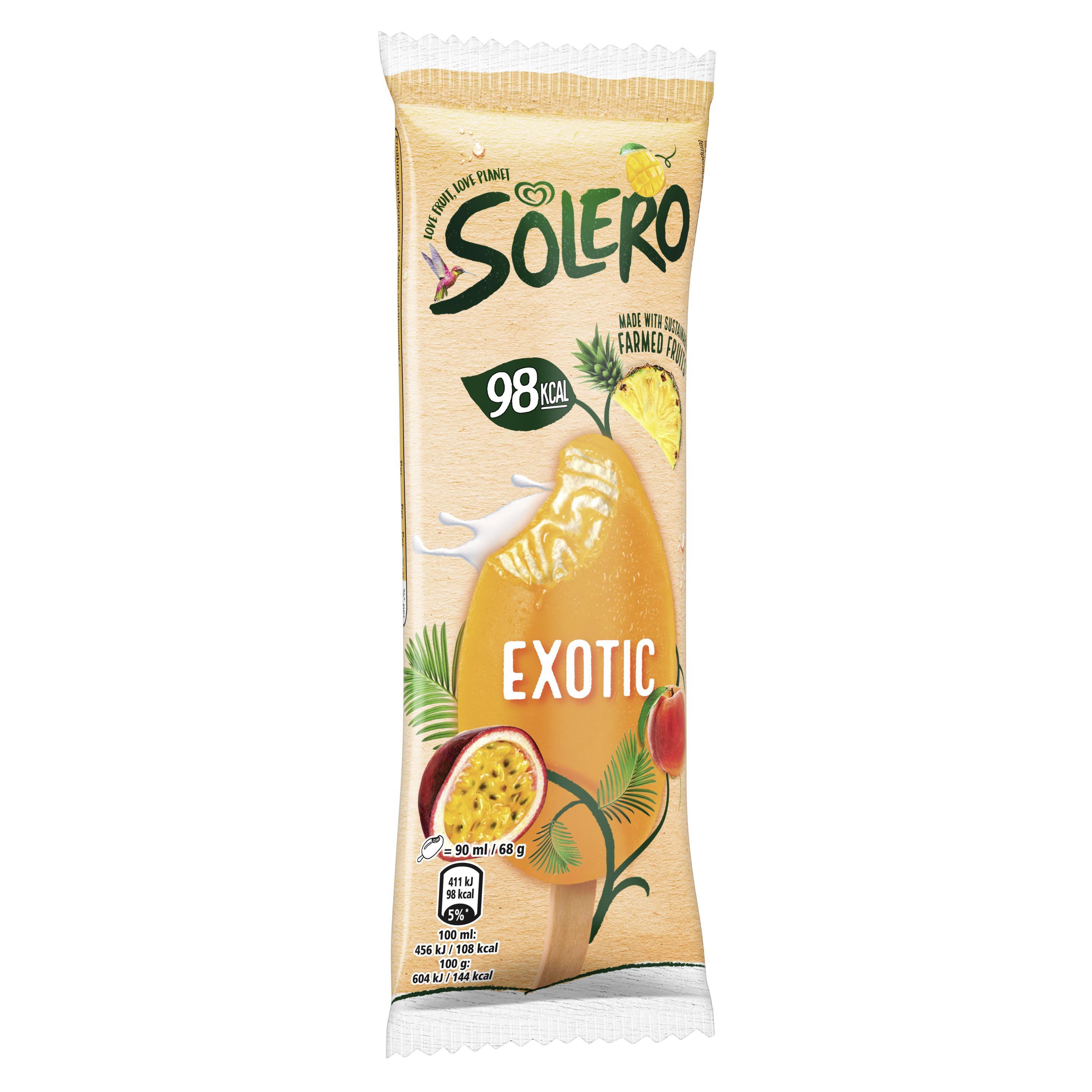 Solero Exotic ist der Fruchtexperte unter den Glacésorten. Es vereint unser beliebtes Vanilleglacé mit fruchtigem Sorbet und einer exotischen Frucht-Sorbet-Hülle. Mit den 98 Kalorien ist es die unwiderstehliche Kombination aus Frucht und Glacé. Es ist der perfekte Sommerbegleiter, aber auch ideal für einen kleinen erfrischenden Snack oder als Dessert nach dem Essen. Das Stielglacé mit Exotic-Frucht-Sorbet bietet Glacé -Genuss