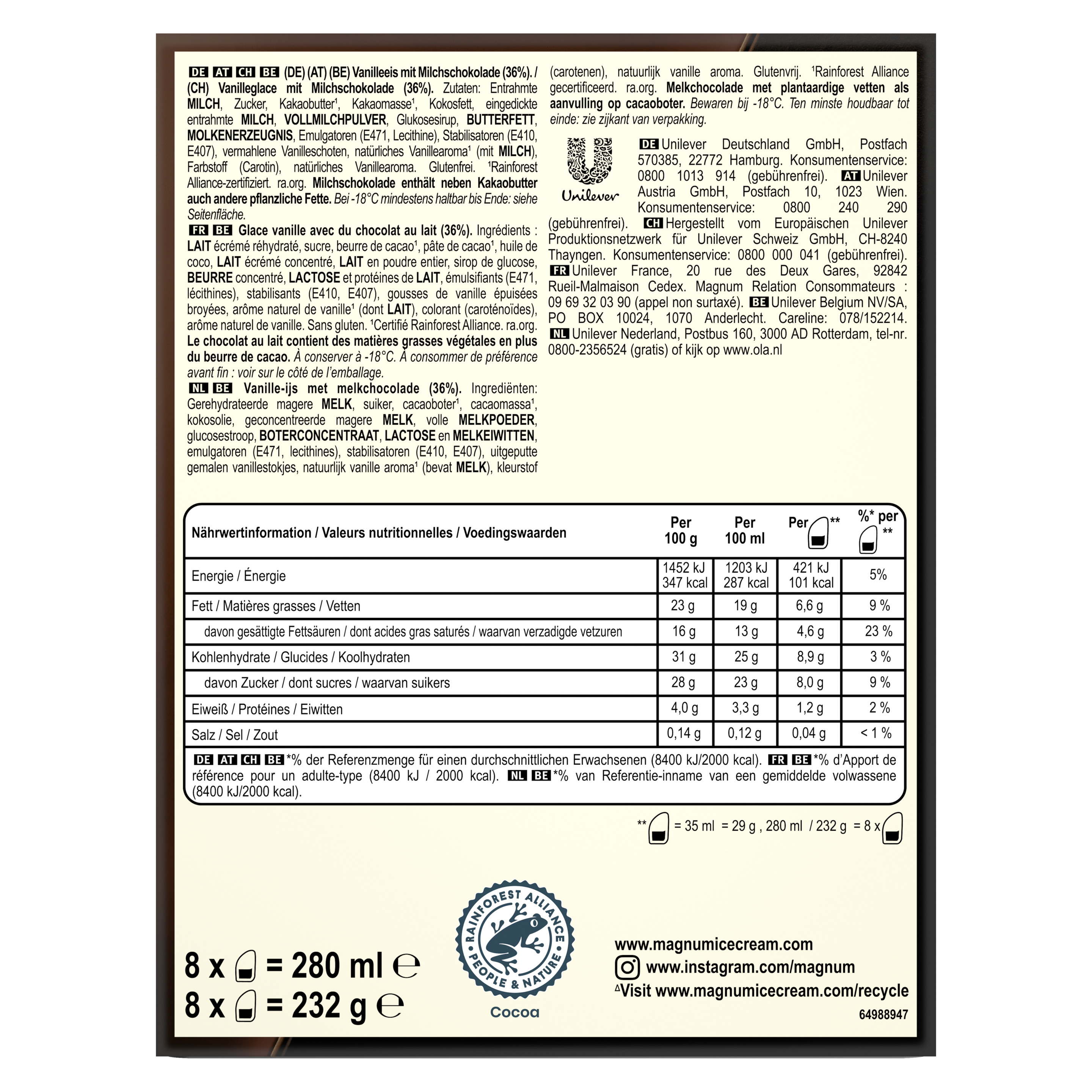 Magnum After Dinner schafft völlig neue Anlässe zum Geniessen – ob zum Kaffee, als Dessert, mit Freunden oder einfach zwischendurch. Kleine Pralinées aus Vanilleglace und knackiger Magnum Classic Schokolade. Jedes Pralinée bietet puren Magnum-Genuss. Die kleinen Pralinées sind in der praktischen Familienpackung 8 x 35 ml erhältlich – so kann man feinen Glace Genuss mit jedermann teilen. Die perfekte Kombination aus knackiger Schokolade und cremigen Glace. Magnum – lebe deinen genuss. Aufregend anders und unverschämt köstlich – so eroberte Magnum im Sommer 1989 als erstes Glace speziell für Erwachsene den Glacemarkt in der Schweiz. Heute ist Magnum mit weltweit mehr als 2 Milliarden verkauften Glace pro Jahr eine der international führenden Glacemarken und die grösste Glacemarke von Unilever. Egal ob klassisches Vanilleglace in einer Milchschokoladenhülle, Fruchtglace, Schokoladenglace, veganes Glace, als Mini Glace oder Becher Glace, die verführerische Welt von Magnum bietet in seinem Sortiment Glace in verschiedensten Variationen und Formaten für noch mehr Vergnügen und für die unterschiedlichsten Anlässe. Nachhaltiger Anbau und Rainforest Alliance-Zertifizierung. Der Kakao stammt in unseren Magnum Glacesorten ausschliesslich von Rainforest-Alliance-zertifizierten Farmen. Deswegen tragen auch alle Magnum Verpackungen das bekannte Rainforest Alliance-Siegel mit dem Frosch. Magnum trägt dazu bei, dass 40.000 Kakaobohnenbauern in Ecuador, Ghana, der Elfenbeinküste und in weiteren westafrikanischen Ländern nachhaltig produzieren. Ziel ist es, durch nachhaltigen Kakaoanbau die Lebensbedingungen der Kakaobauern und ihrer Familien zu verbessern und die Umwelt zu schonen.