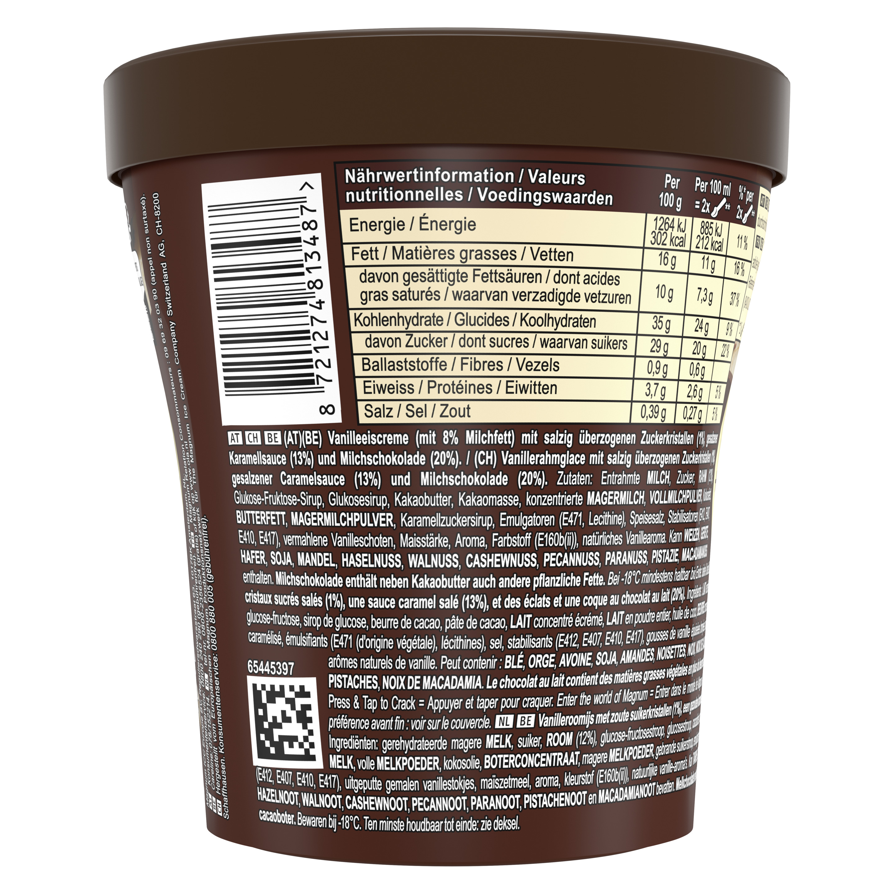 Magnum Crackables Glace Becher Salted Caramel (440 ml) – Voller Magnum Glace Genuss auch zum Löffeln: Die Magnum Becher sorgen für unwiderstehliche Momente für alle Geniesser. Der Magnum Salted Caramel Glace Becher ist eine cremige Glace mit Vanille, verstrudelt mit einer gesalzenen Caramelsauce, umhüllt von knackiger Magnum-Milchschokolade und bestreut mit salzig überzogenen Zuckerkristallen. Um an die feine Glace und die gesalzene Caramelsauce des Magnum Bechers Salted Caramel zu gelangen, muss der Deckel aus Magnum-Schokolade und die Schokoladenhülle an den Seiten erst geknackt werden. Made to be broken. Drücken, knacken und geniessen.Die verführerische Welt von Magnum bietet eine grosse Vielfalt: seien es die Magnum Klassiker mit cremigem Vanilleglace in einer knackigen Schokoladenhülle, fruchtige Sorten, die Magnum bonbons im Bite-Format, vegane Varianten, Mini-Glace oder Glace im Becher – Magnum hat für jeden Geschmack und Anlass das passende Produkt. Perfekt für den kleinen Luxus zwischendurch, zum Teilen mit Freunden oder als kleine Belohnung für sich selbst. Magnum steht für puren Genuss und Qualität. Jede Magnum Glace wird mit sorgfältig ausgewählten Zutaten hergestellt – die Kombination aus cremigem Glace und knackiger Schokolade macht Magnum zu einem puren Genuss-Erlebnis. Seit 1989 begeistert Magnum als erste Glace speziell für Erwachsene den deutschen Markt und steht heute weltweit für Premium-Glacegenuss. Mit über 2 Milliarden verkauften Glacen pro Jahr ist Magnum die grösste Glacemarke von The Magnum Ice Cream Company und eine der führenden Glace-Marken weltweit. Magnum – lebe deinen Genuss.
