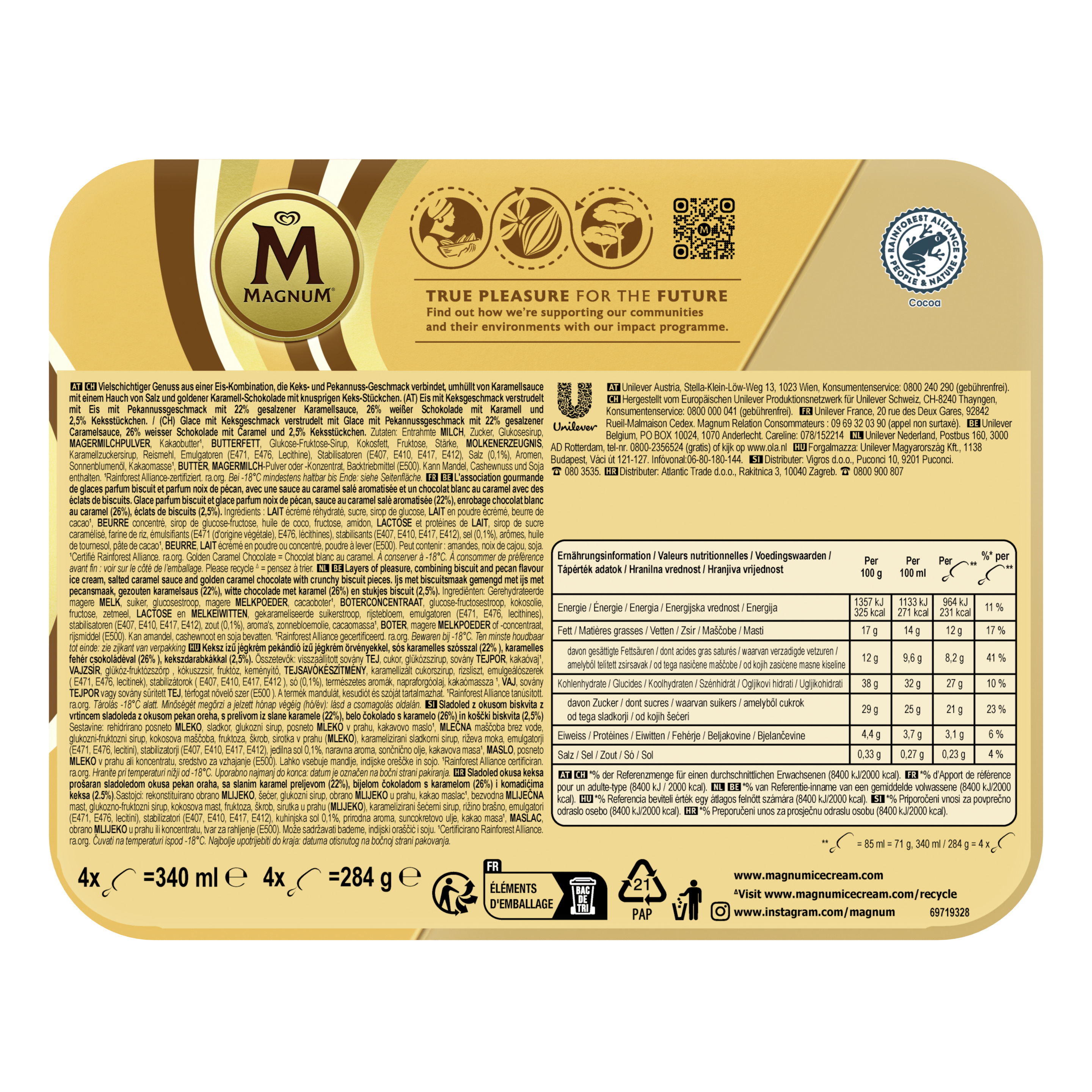 Magnum Double Gold Caramel Billionaire ist cremiges Glace mit Keks- und Pekannuss-Geschmack, umhüllt von gesalzener Karamellsauce, goldfarbener Karamell-Schokolade und knusprigen Keksstückchen. Die natürlich goldfarbene Premium-Schokolade sorgt für ein besonderes Glaceerlebnis. Das Stengel Glace vereint den Geschmack von gesalzenem Karamell und knusprigen Keksen. Das vielschichtige Magnum Stengel Glace ist in der praktischen Familienpackung 4 x 85 ml erhältlich – so kann man feinen Glace Genuss mit jedermann teilen.