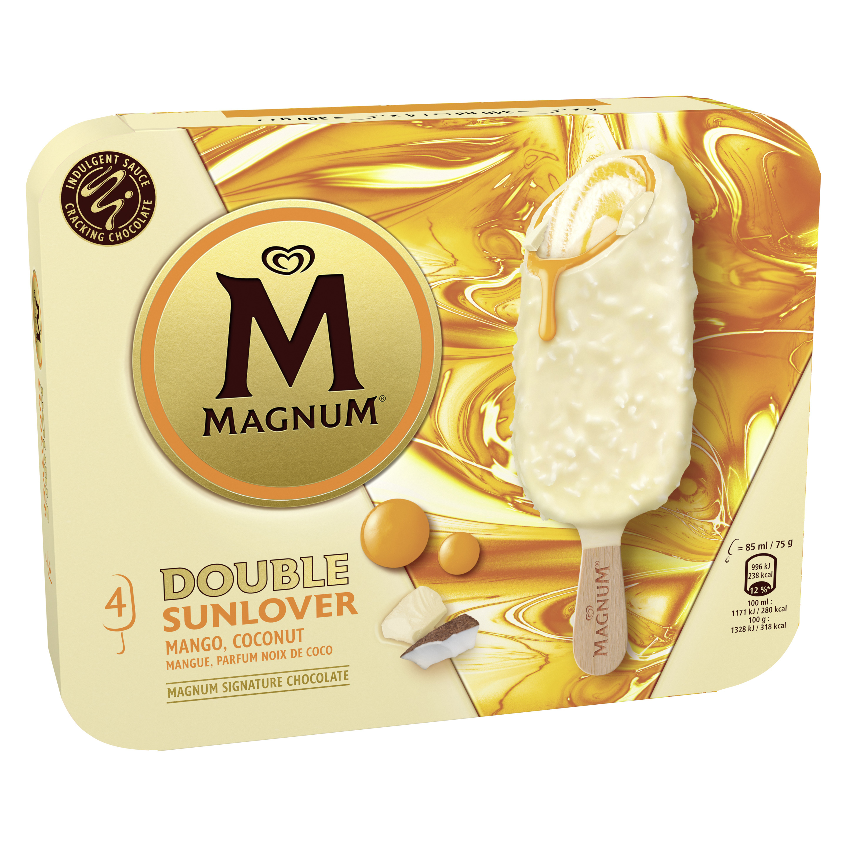 Magnum Double Sunlover ist köstliches Kokosnussglace, verstrudelt mit Mango- und Passionsfrucht-Glace, umhüllt von Mango-Passionsfruchtsauce, weisser Schokolade und Kokosnussflocken. Das feine Magnum Stengel Glace ist in der praktischen Vorratspackung 4 x 85 ml erhältlich – so kann man Glace-Genuss mit jedermann teilen. Die perfekte Balance: Weisse Schokolade und cremiges Glace.