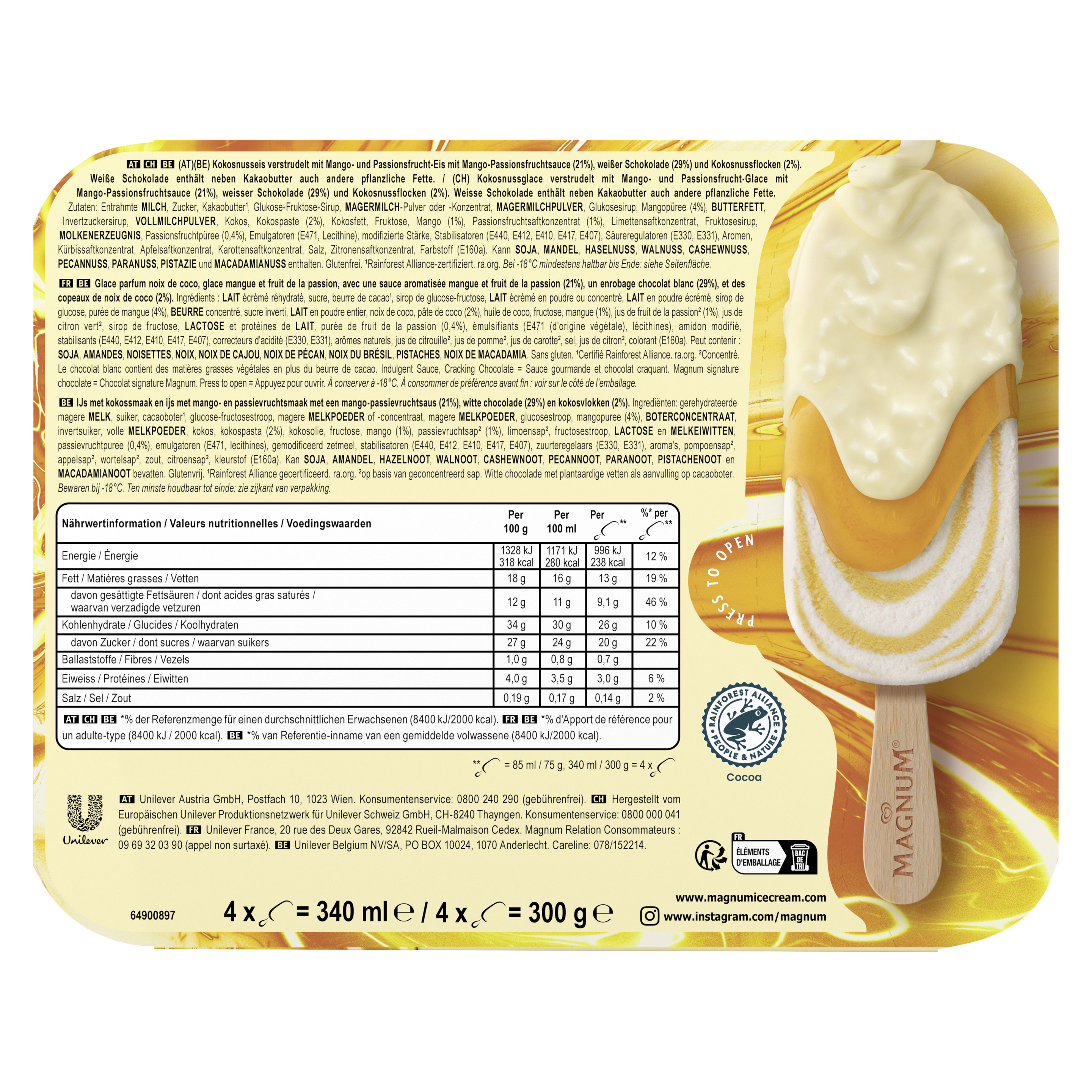 Zutaten: Entrahmte MILCH, Zucker, Kakaobutter¹, Glukose-Fruktose-Sirup, MAGERMILCH-Pulver oder -Konzentrat, MAGERMILCHPULVER, Glukosesirup, Mangopüree (4%), BUTTERFETT, Invertzuckersirup, VOLLMILCHPULVER, Kokos, Kokospaste (2%), Kokosfett, Fruktose, Mango (1%), Passionsfruchtsaftkonzentrat (1%), Limettensaftkonzentrat, Fruktosesirup, MOLKENERZEUGNIS, Passionsfruchtpüree (0,4%), Emulgatoren (E471, Lecithine), modifizierte Stärke, Stabilisatoren (E440, E412, E410, E417, E407), Säureregulatoren (E330, E331), Aromen, Kürbissaftkonzentrat, Apfelsaftkonzentrat, Karottensaftkonzentrat, Salz, Zitronensaftkonzentrat, Farbstoff (E160a). Kann Mandeln und Soja enthalten.¹Rainforest Alliance-zertifiziert.