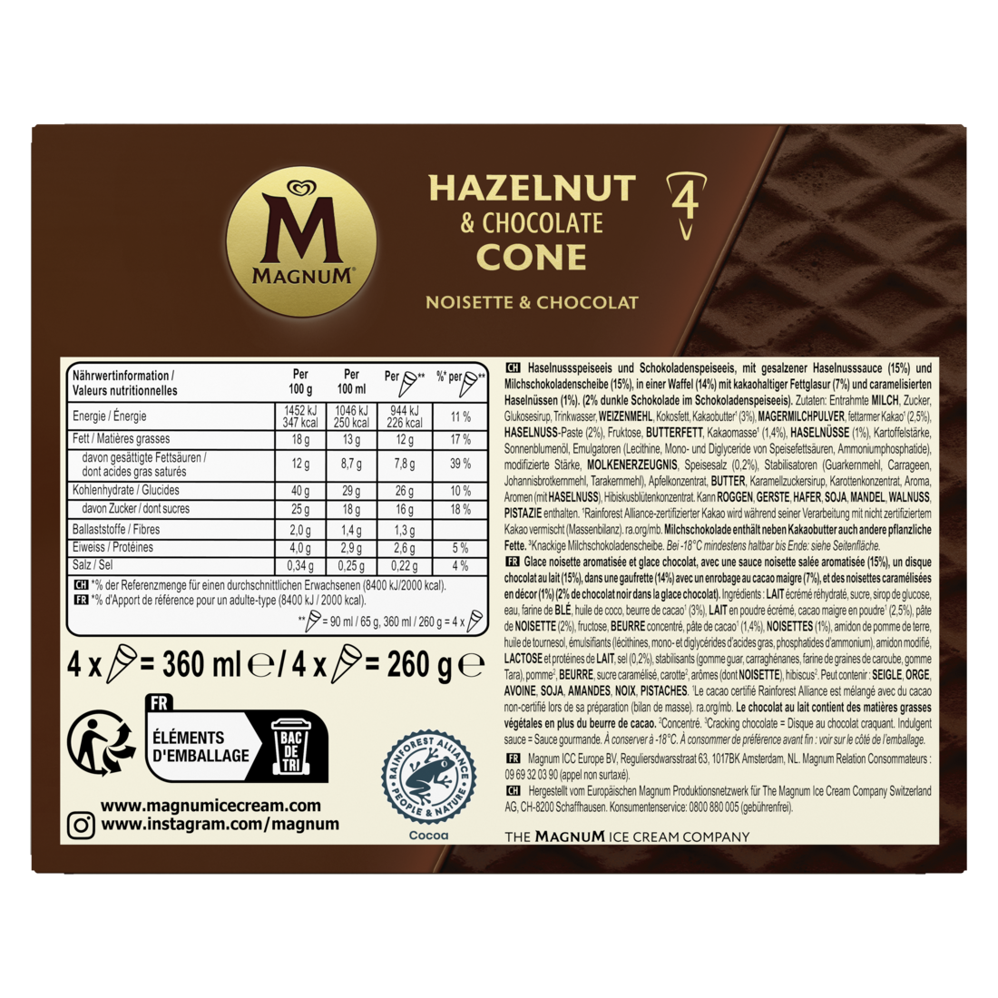 Mit dem Magnum Cornet Hazelnut & Chocolate (4 x 90 ml) präsentiert die Premium-Glacemarke fein abgestimmte Zutaten mit cremiger Glace, neuen, überraschenden Texturen und dem charakteristischen Knacken. Die verführerische Welt von Magnum bietet eine grosse Vielfalt: seien es die Magnum Klassiker mit cremigem Vanilleglace in einer knackigen Schokoladenhülle, fruchtige Sorten, die Magnum bonbons im Bite-Format, vegane Varianten, Mini-Glace oder Glace im Becher – Magnum hat für jeden Geschmack und Anlass das passende Produkt. Perfekt für den kleinen Luxus zwischendurch, zum Teilen mit Freunden oder als kleine Belohnung für sich selbst. Magnum steht für puren Genuss und Qualität. Jede Magnum Glace wird mit sorgfältig ausgewählten Zutaten hergestellt – die Kombination aus cremigem Glace und knackiger Schokolade macht Magnum zu einem puren Genuss-Erlebnis. Seit 1989 begeistert Magnum als erste Glace speziell für Erwachsene den deutschen Markt und steht heute weltweit für Premium-Glacegenuss. Mit über 2 Milliarden verkauften Glacen pro Jahr ist Magnum die grösste Glacemarke von The Magnum Ice Cream Company und eine der führenden Glace-Marken weltweit. Magnum – lebe deinen Genuss.