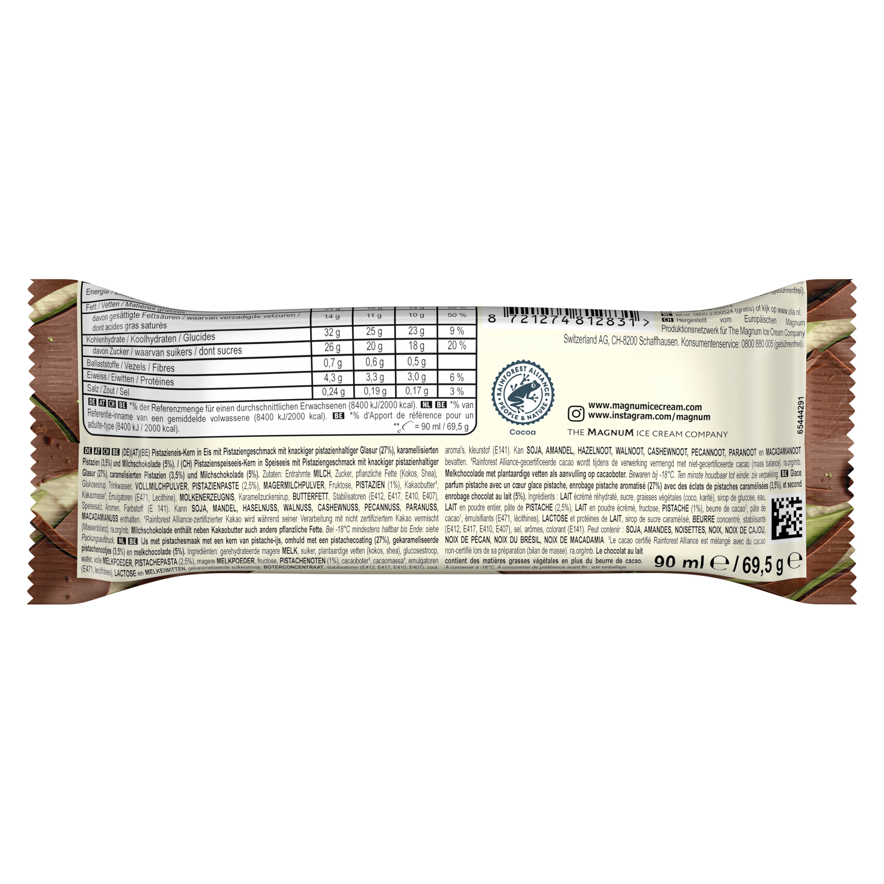Zutaten: Entrahmte MILCH, Zucker, pflanzliche Fette (Kokos, Shea), Glukosesirup, Trinkwasser, VOLLMILCHPULVER, PISTAZIENPASTE (2,5%), MAGERMILCHPULVER, Fruktose, PISTAZIEN (1%), Kakaobutter¹, Kakaomasse¹, Emulgatoren (E471, Lecithine), MOLKENERZEUGNIS, Karamellzuckersirup, BUTTERFETT, Stabilisatoren (E412, E417, E410, E407), Speisesalz, Aromen, Farbstoff (E 141). Kann SOJA, MANDEL, HASELNUSS, WALNUSS, CASHEWNUSS, PECANNUSS, PARANUSS, MACADAMIANUSS enthalten. ¹Rainforest Alliance-zertifizierter Kakao wird während seiner Verarbeitung mit nicht zertifiziertem Kakao vermischt (Massenbilanz).