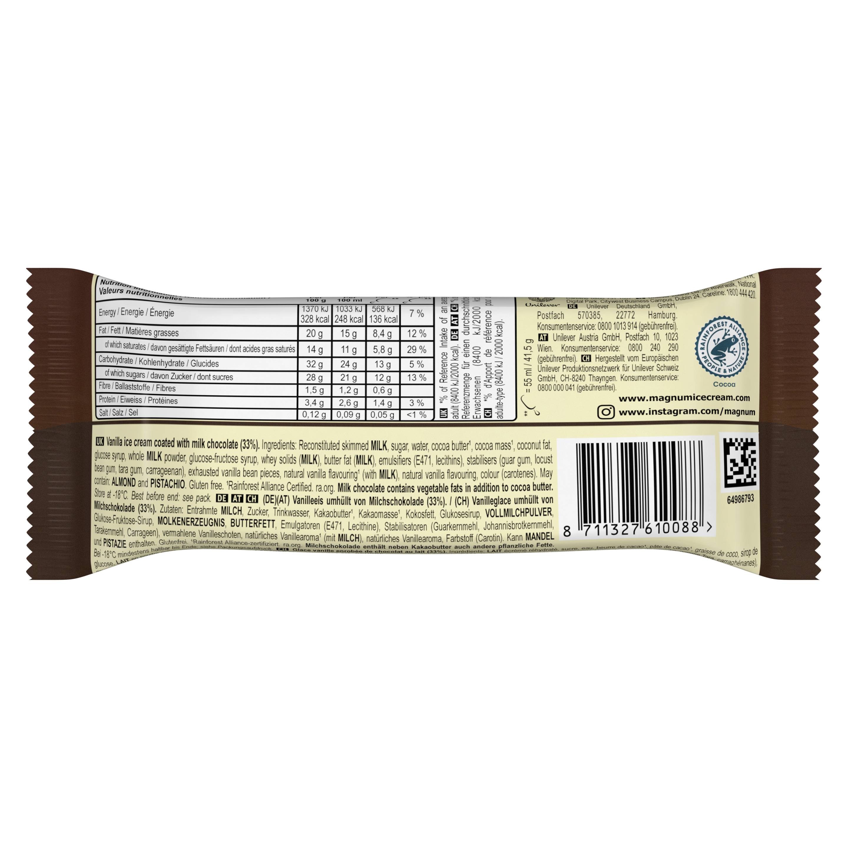 Zutaten: Entrahmte MILCH, Zucker, Trinkwasser, Kakaobutter¹, Kakaomasse¹, Kokosfett, VOLLMILCHPULVER, Glukose-Fruktose-Sirup, Glukosesirup, MOLKENERZEUGNIS, BUTTERFETT, Emulgatoren (E471, Lecithine), Stabilisatoren (Guarkernmehl, Johannisbrotkernmehl, Tarakernmehl, Carrageen), vermahlene Vanilleschoten, natürliche Vanillearomen, Farbstoff (Carotin). Kann MANDEL, HASELNUSS, WALNUSS, CASHEWNUSS, PECANNUSS, PARANUSS, PISTAZIE, MACADAMIANUSS enthalten.¹Rainforest Alliance-zertifizierter Kakao wird während seiner Verarbeitung mit nicht zertifiziertem Kakao vermischt (Massenbilanz).