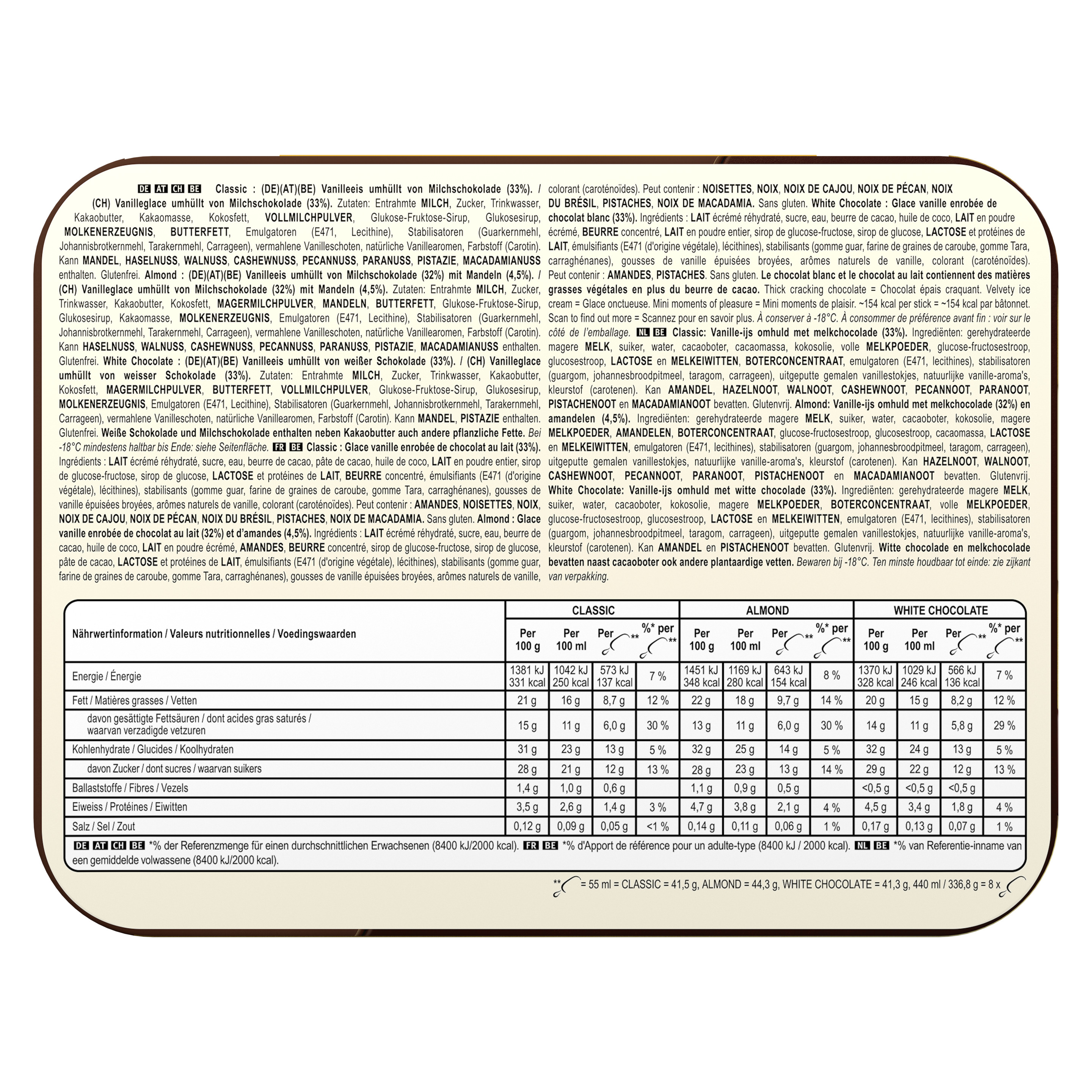 Drei unwiderstehliche Klassiker im Mini-Format- Knackige Schokolade trifft auf cremiges Premium-Glace mit Vanille aus Madagaskar und Mandeln aus Kalifornien.