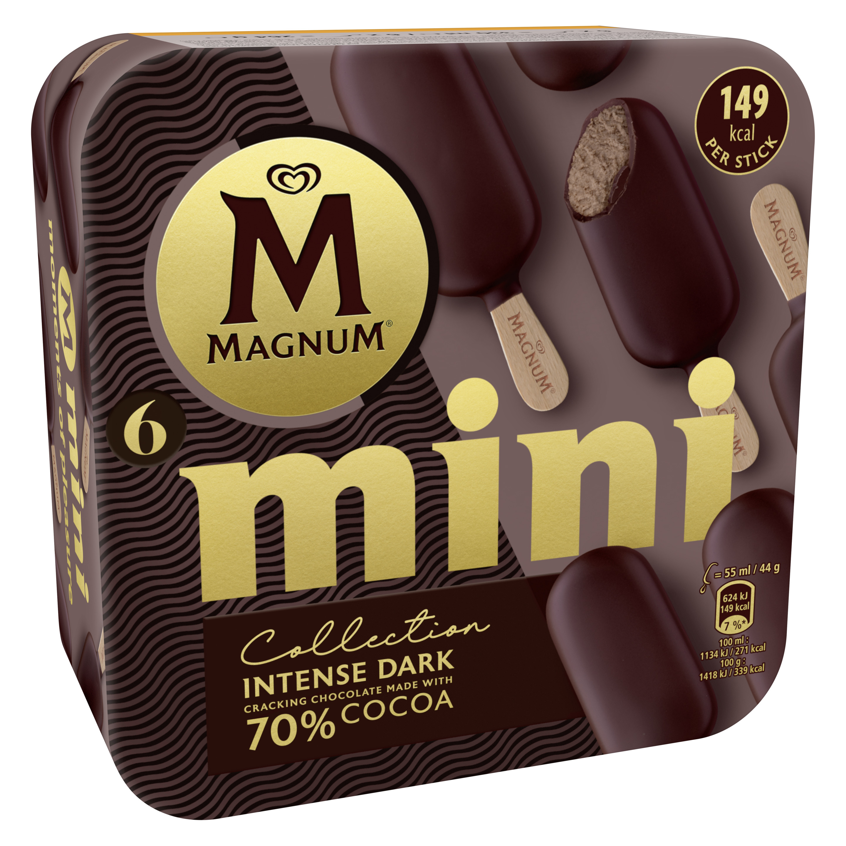 Für die kleinen Snackmomente zwischendurch gibt es jetzt das Magnum Mini Intense Dark. Vollmundiges Schokoladenglace umhüllt von einem knackigen Mantel aus dunkler Schokolade mit einem Kakaoanteil von 70%. Im praktischen Vorratspack, damit man den feinen Genuss mit jedermann teilen kann.