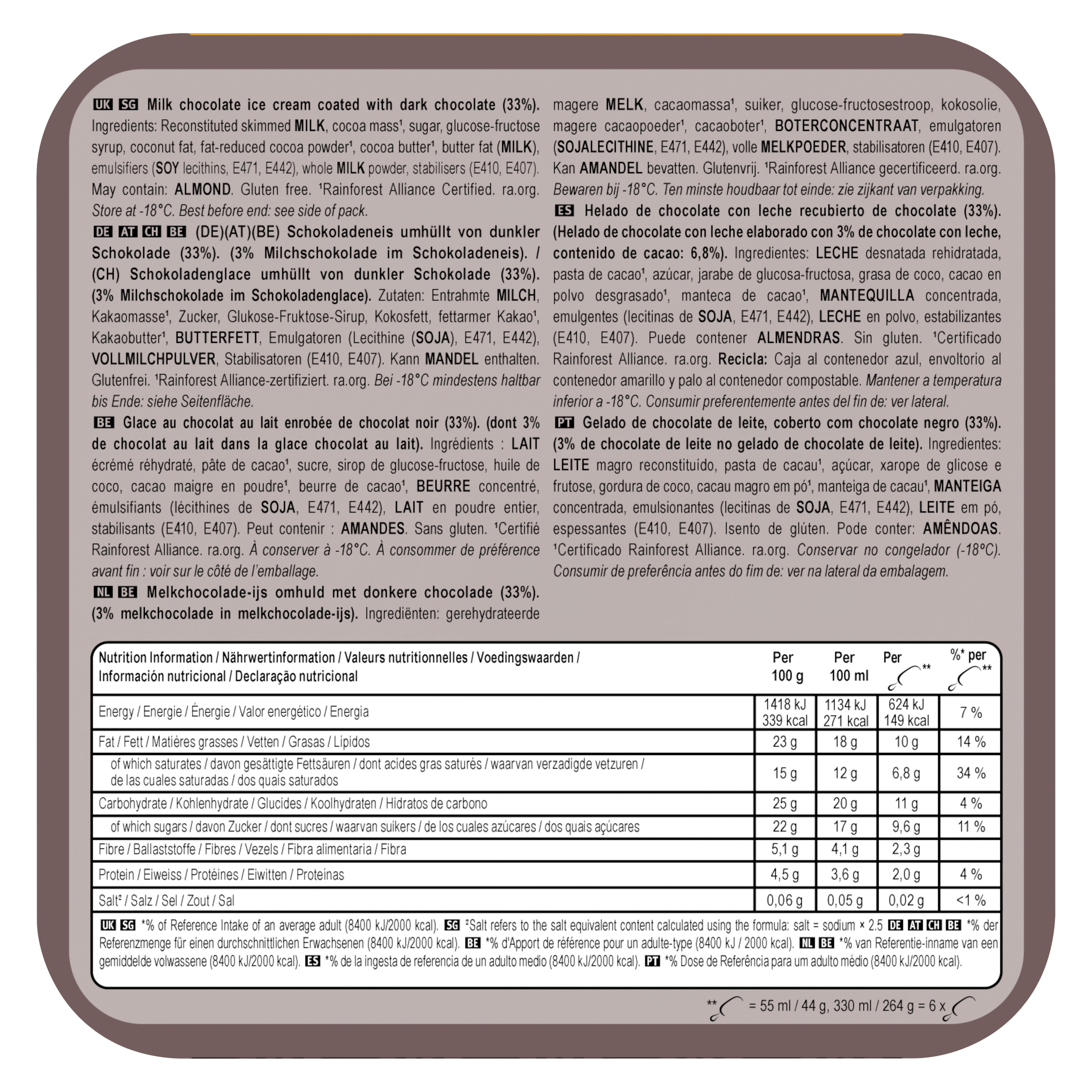Zutaten: Entrahmte MILCH, Kakaomasse¹, Zucker, Glukose-Fruktose-Sirup, Kokosfett, fettarmer Kakao¹, Kakaobutter¹, BUTTERFETT, Emulgatoren (Lecithine (SOJA), E471, E442), VOLLMILCHPULVER, Stabilisatoren (E410, E407). Kann MANDEL enthalten.¹Rainforest Alliance-zertifiziert.