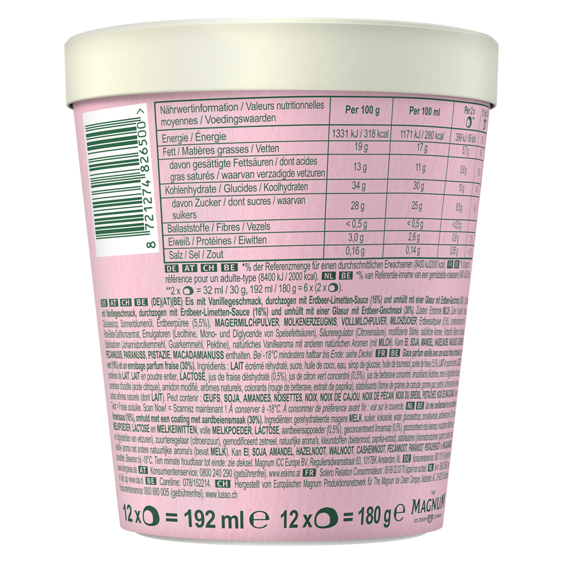 Zutaten: Entrahmte MILCH, Zucker, Kokosfett, Trinkwasser, Glukosesirup, Sonnenblumenöl, Erdbeerpüree (5,5%), MAGERMILCHPULVER, MOLKENERZEUGNIS, VOLLMILCHPULVER, MILCHZUCKER, Erdbeersaftpulver (0,5%), Limettensaftkonzentrat (0,5%), Rote-Bete-Saftkonzentrat, Emulgatoren (Lecithine, Mono- und Diglyceride von Speisefettsäuren), Säureregulator (Citronensäure), modifizierte Stärke, natürliche Aromen, Farbstoffe (Betenrot, Paprikaextrakt), Stabilisatoren (Johannisbrotkernmehl, Guarkernmehl, Pektine), natürliches Vanillearoma mit anderen natürlichen Aromen (mit MILCH). Kann EI, SOJA, MANDEL, HASELNUSS, WALNUSS, CASHEWNUSS, PECANNUSS, PARANUSS, PISTAZIE, MACADAMIANUSS enthalten.