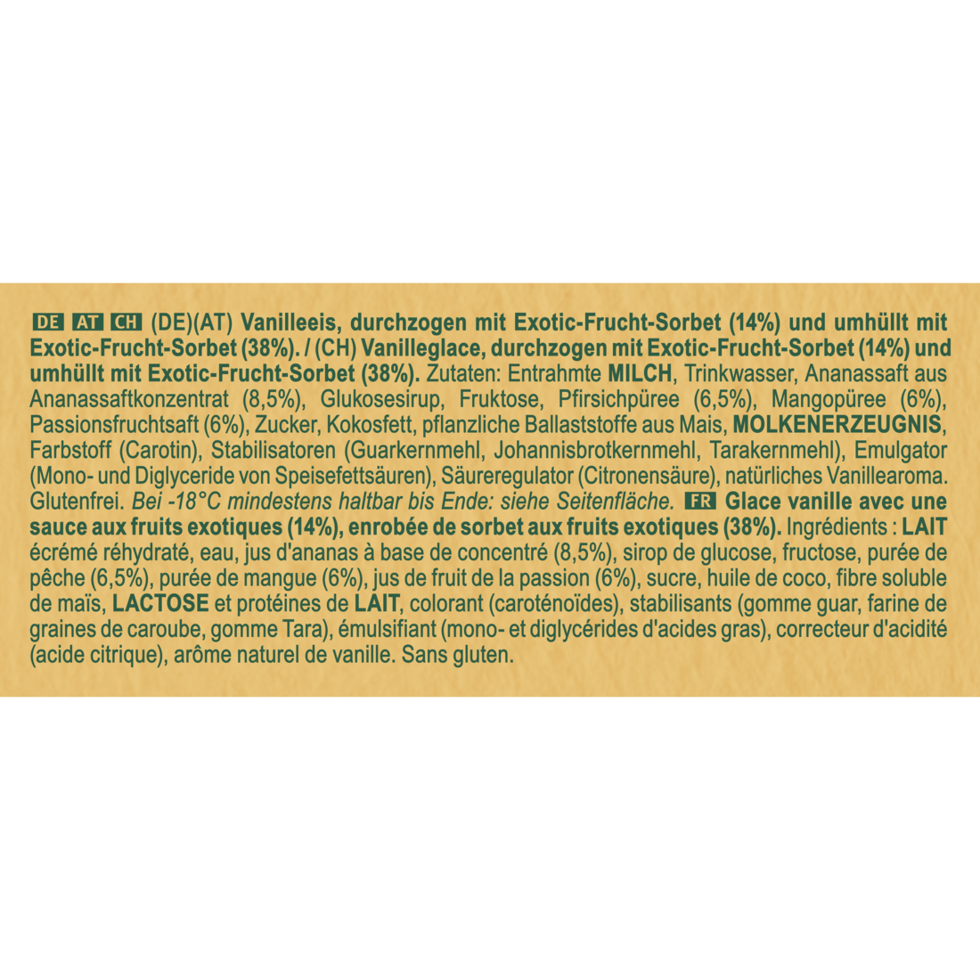 Zutaten: Entrahmte MILCH, Trinkwasser, Ananassaft aus Ananassaftkonzentrat (8,5%), Glukosesirup, Fruktose, Pfirsichpüree (6,5%), Mangopüree (6%), Passionsfruchtsaft (6%), Zucker, Kokosfett, pflanzliche Ballaststoffe aus Mais, MOLKENERZEUGNIS, Farbstoff (Carotin), Stabilisatoren (Guarkernmehl, Johannisbrotkernmehl, Tarakernmehl), Emulgator (Mono- und Diglyceride von Speisefettsäuren), Säureregulator (Citronensäure), natürliches Vanillearoma.